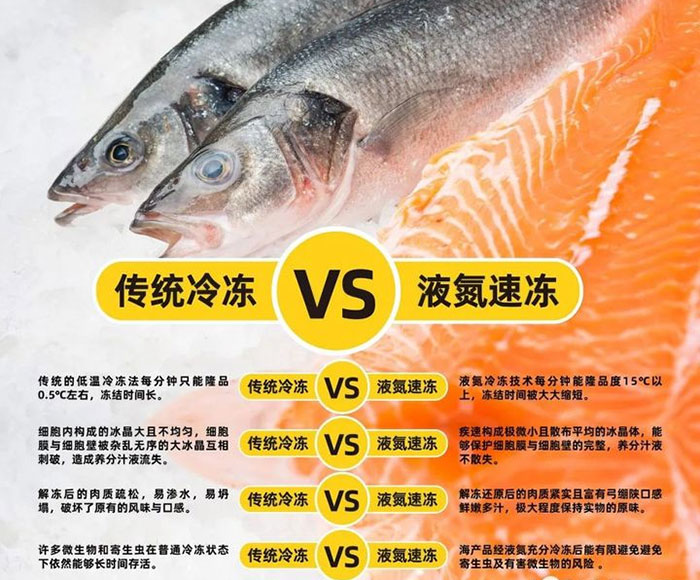 极速急冻,最大化保留海鲜的鲜度传统冰块冷冻时间通常要6个小时以上,漫长的降温过程对蛋白质和结构形成不小的破坏。运用液氮鲜冻技术,在3到12分钟内完成冻结过程,对组织结构破坏程度大大降低,解冻后的海鲜基本能保持原有新鲜度。保水率高,口感更好由于超速急冻能使细胞内和细胞间隙中的水同时冻结,变成肉眼看不见的无数微细均匀的冰晶体,减少了细胞内水份外析,海鲜汁液不会流失,口感更好。冰晶更微小,海鲜的品质更高由于液氮鲜冻技术的冰晶体是肉眼看不见的、更加微细均匀的冰晶体,细胞组织不受破坏,冻结后的海鲜产品品质也更高。细胞不破坏,营养不流失不破坏细胞组织、不产生营养流失现象,可以提供更加良好的营养价值。更好的隔绝细菌,保证食品安全液氮急速保鲜技术所产生的气体是隋性的氮气,液氮在汽化过程中隔绝了空气起到了保护食品的作用。另外超低温让产品速冻时能完全有效杀毒灭菌作用,不需要担心食品附带的细菌繁殖破坏食品。
